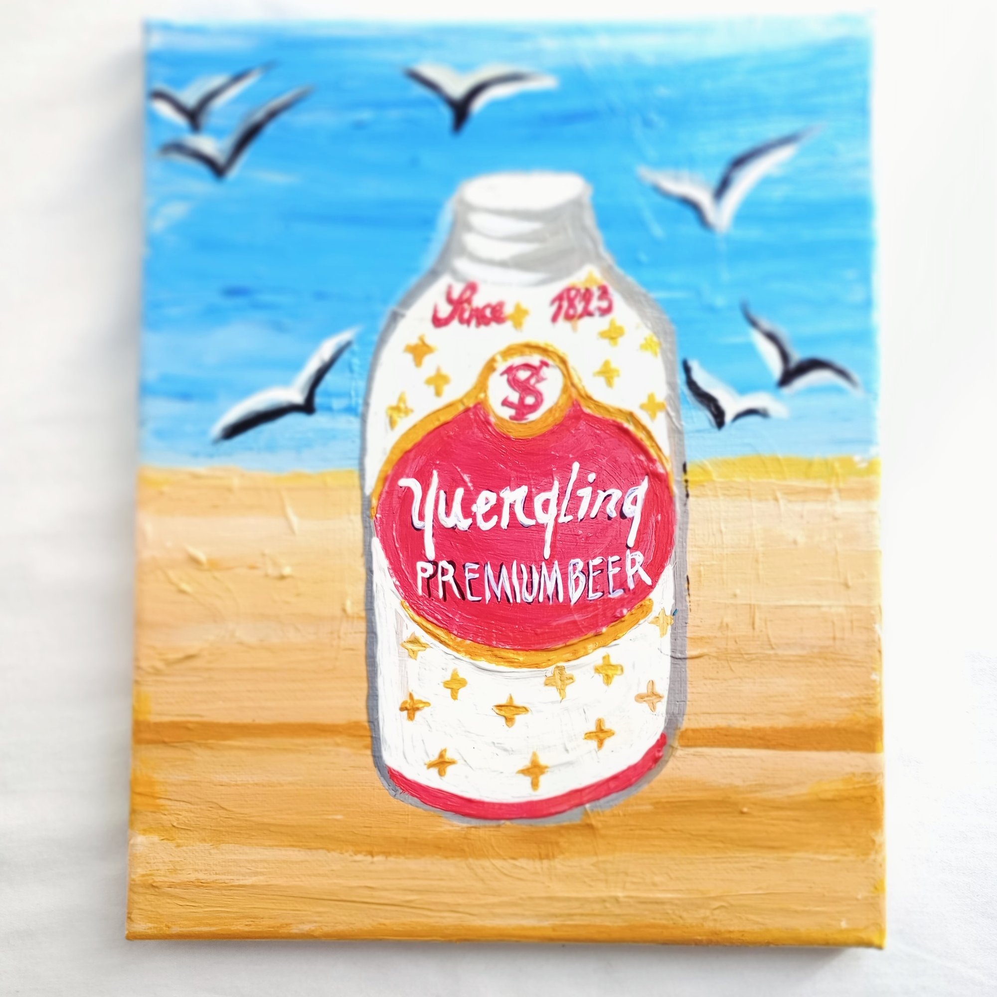Beer & Beach-themed smaller painting.Acrylic on 8X10in. Canvas makes for a fun addition to any wall space or at-home bar pairing.Includes free art stickers.